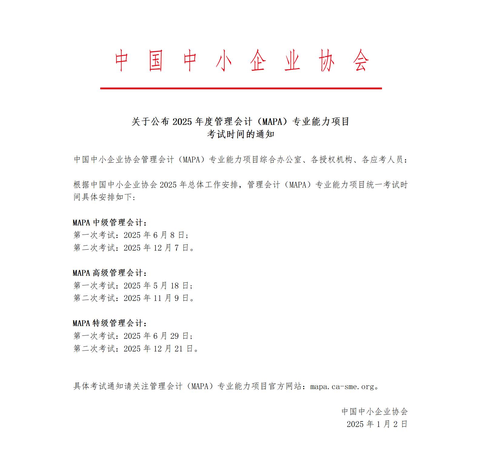 关于公布2025年度管理会计(MAPA)专业能力项目考试时间的通知